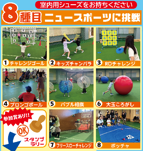 ○内 容:「ニュースポーツに挑戦(8種目)」を巡って、スタンプを5個以上集めると参加できます。