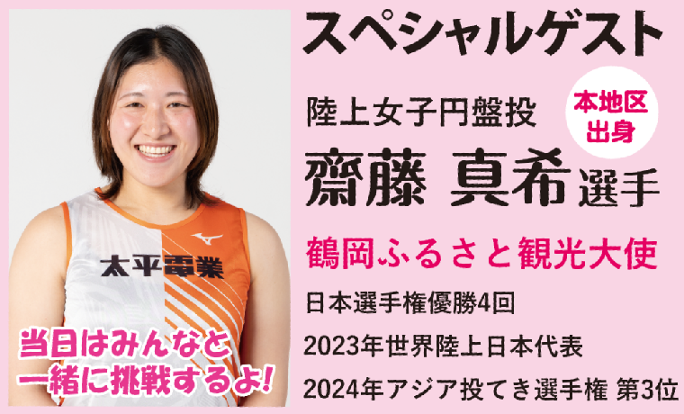スペシャルゲストには、今年も“鶴岡ふるさと観光大使”の陸上女子円盤投の”齋藤 真希”選手が参加予定!当日は子どもたちと一緒に様々なスポーツに挑戦いただきます。親子でスポーツに親しみ、スポーツの楽しさを実感しましょう!