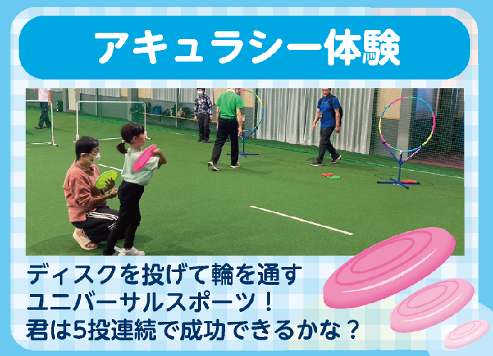 ○内 容:全国障害者スポーツ大会の種目にもなっている「フライングディスク(アキュラシー)」を体験できます。