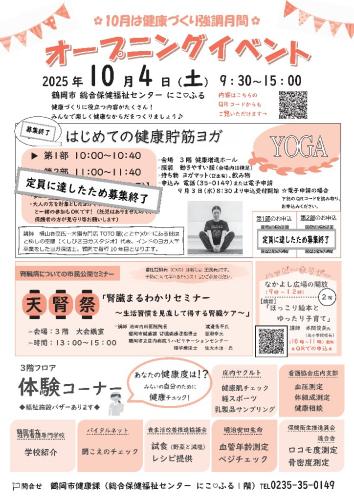 鶴岡市では、10月を「健康づくり強調月間」と定め、市民の皆様の健康づくりを推進していけるように、関係機関と連携してイベントや展示、講演会などの催しを行います。