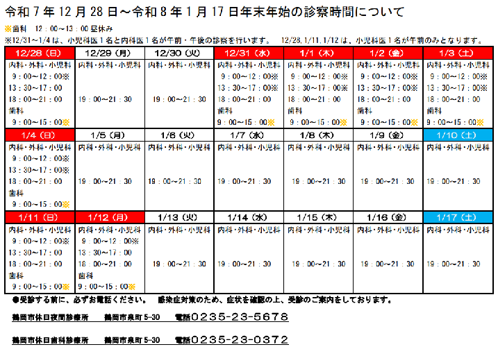 休日夜間診療所の年末年始情報(上記画像と同じ内容)
