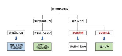 A3.簡単に取り外すことができるものは取り外してください。取り外しが難しい場合は無理に分解すると発火の危険があります。30センチメートル以下のものは「蛍光管・乾電池等」の日に、電池類が内蔵された状態のまま出してください。30センチメートルを超えるものは、「粗大ごみ」となります。