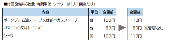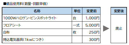 農村センターのみ定めている備品類の使用料金について、近年の利用実績はなく、維持管理も困難であることから料金設定を廃止します。