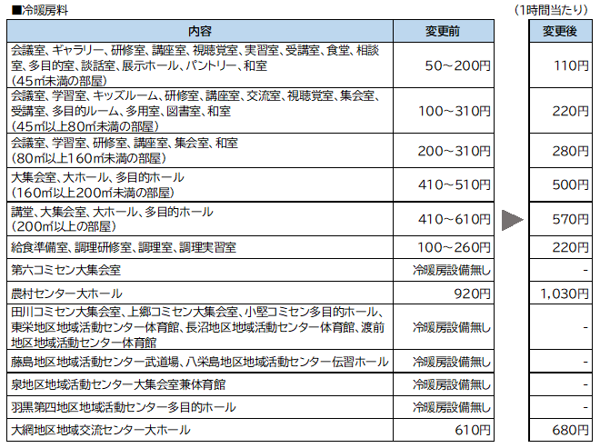 ※各コミュニティセンター等の部屋別冷暖房料一覧は、近日中に公開します。