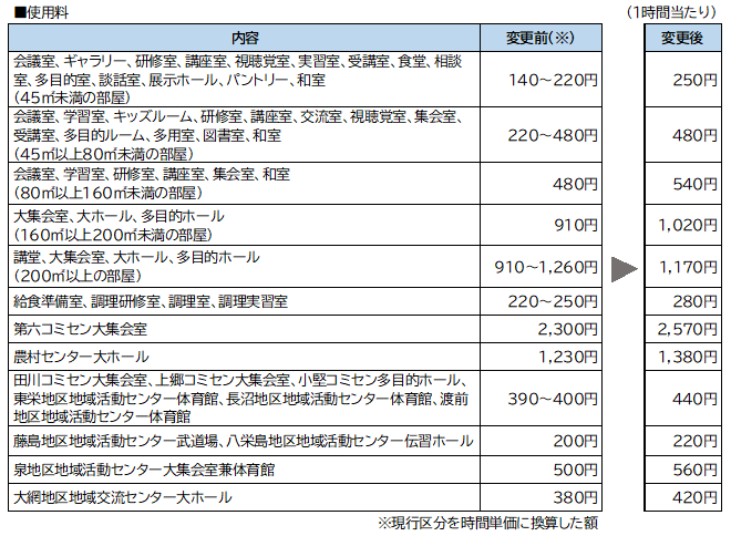 ※各コミュニティセンター等の部屋別使用料一覧は、近日中に公開します。