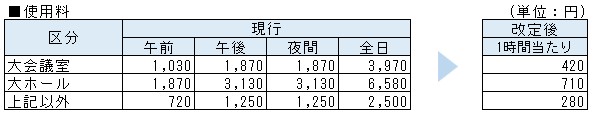 最近の原油価格及び物価高騰等の影響により、公共施設の維持管理コストが増大している状況を踏まえ、受益者負担の原則に照らした適切な価格転嫁を行う観点から、当該施設における使用料を見直します。あわせて、使用者の利便性及び施設の稼働率の向上を図るべく使用区分を時間単位に移行します。