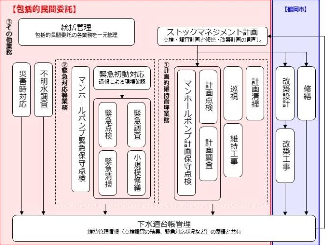 鶴岡市は、これまで別々に発注していた下水道施設の点検調査・清掃・修繕など業務をまとめて委託発注し、民間業者の技術力・ノウハウを最大限活用する包括的民間委託による維持管理を行っています。