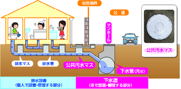 下水道本管、マンホール、取付管、公共汚水マス、マンホールポンプ