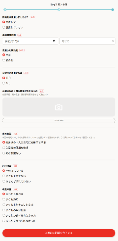 保護者画面にて【体温や様子】【症状】【薬と食事】の3ページで構成されていますので、当日の様子をご入力ください。