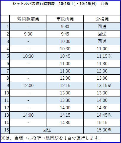 シャトルバスは、両日とも 市役所~会場間 及び 鶴岡駅~市役所~会場間 で運行します。