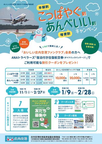 庄内空港利用振興協議会では、庄内羽田線の冬期間の利用促進とおいしい庄内空港ファンクラブ会員の拡大を図るため、往路早朝便または期間増便にご搭乗いただく方を対象に、宿泊付き往復航空券をお得にご利用できる割引クーポン(ファンクラブ会員は増額)を発行します。