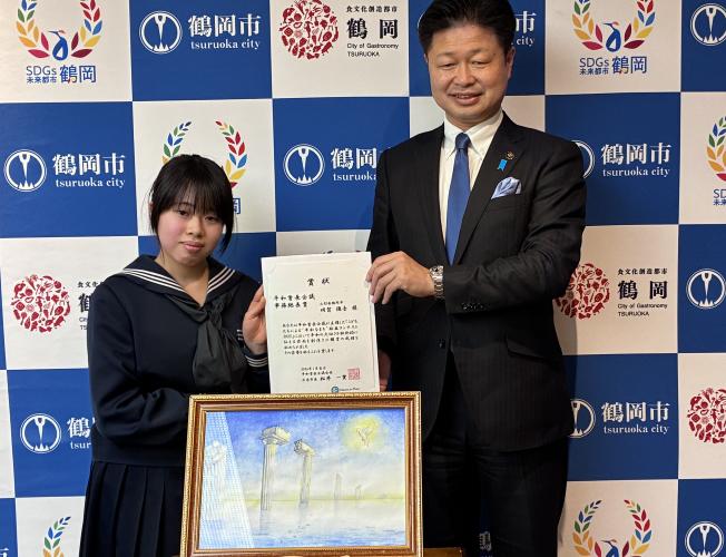 審査の結果、本市の明賀璃音さんの作品が「平和首長会議事務総長賞」を受賞したことから、表彰状を授与しました。