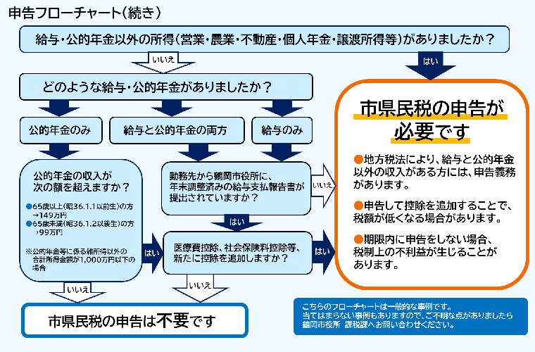 - 給与・公的年金以外の所得が20万を超える方や、給与収入が2,000万円を超える方は、市民税・県民税申告ではなく確定申告が必要です。